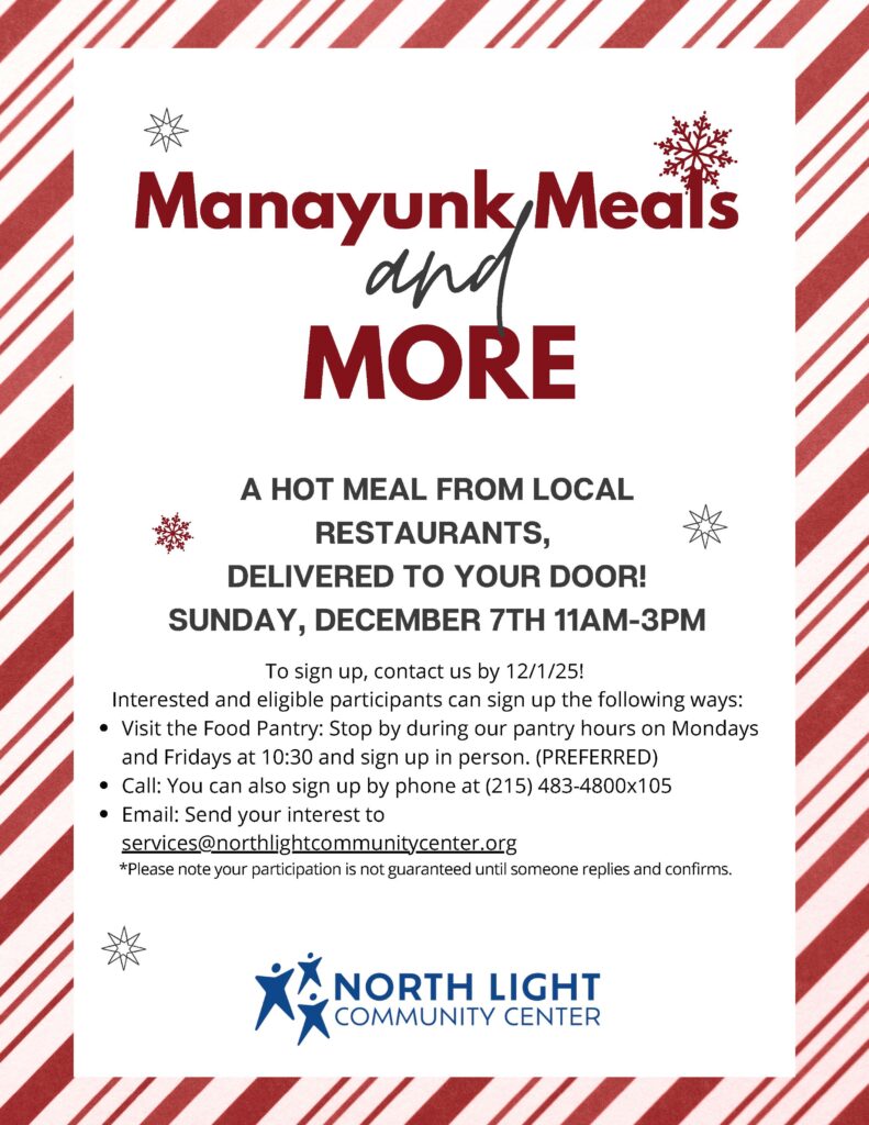 If you are immunocompromised, have a disability, or are a senior citizen, delivery services might be available. You must reside in 19127, 19128, 19129, or 19144. To be added to our delivery list, please contact Malachi at mwoodard@northlightcommunitycenter.org or 215-483-4800 x103.